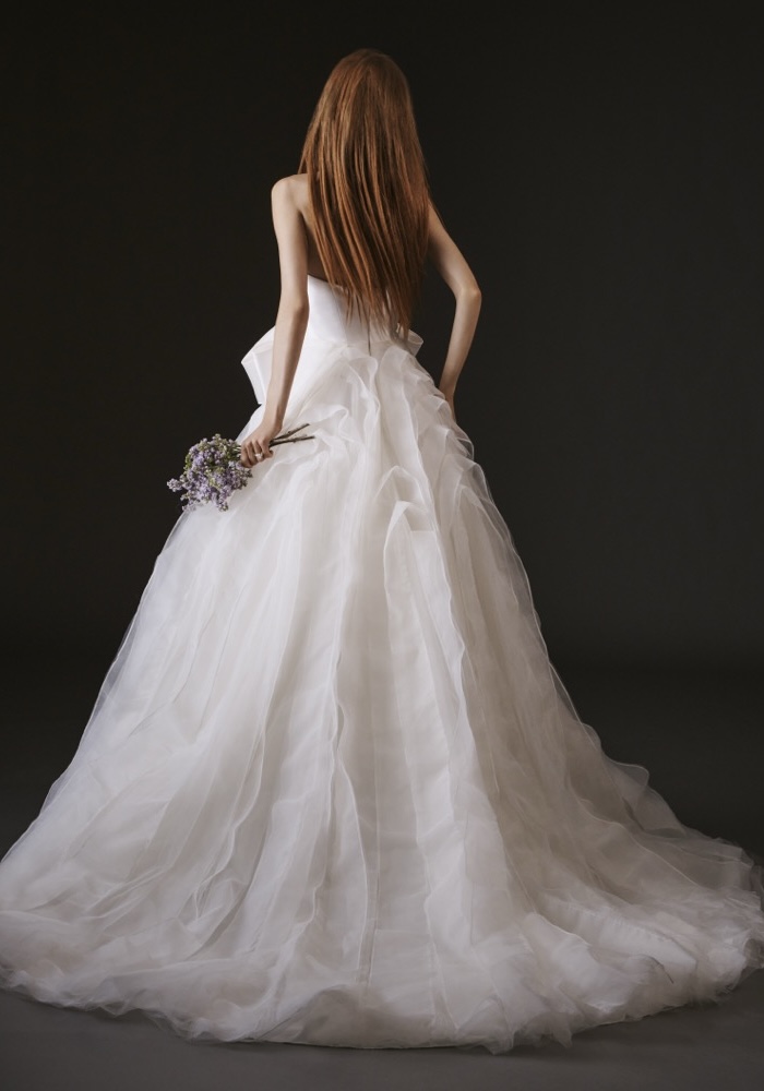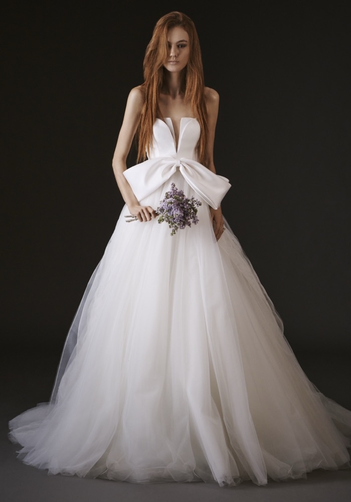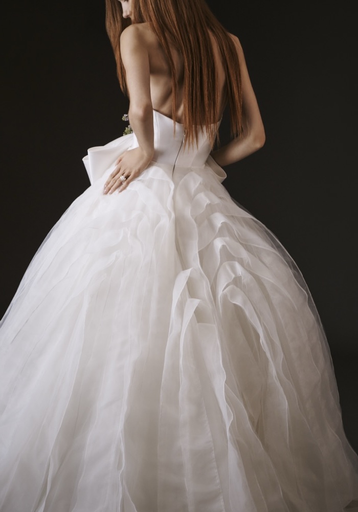 Strapless princess wedding dress with a tailored mikado bodice decorated with an oversized waist bow. Voluminous skirt made of layers of soft tulle with ruffle detail at the back and a chapel train.