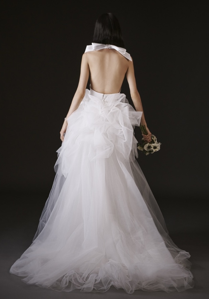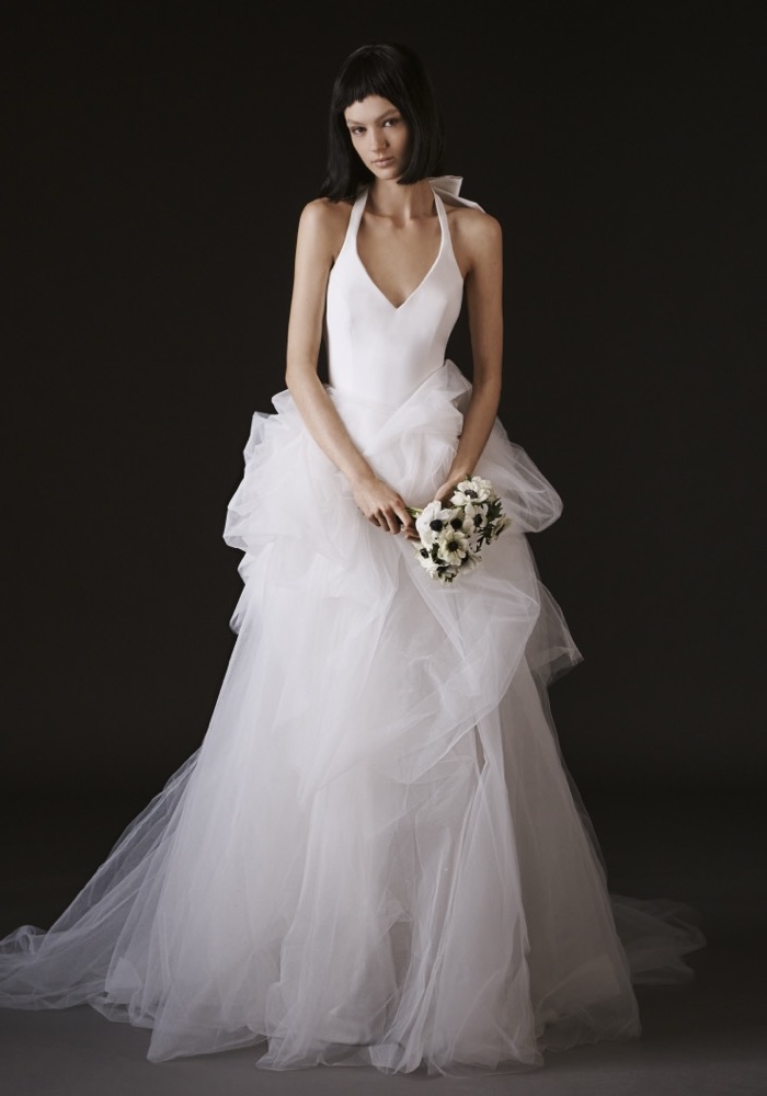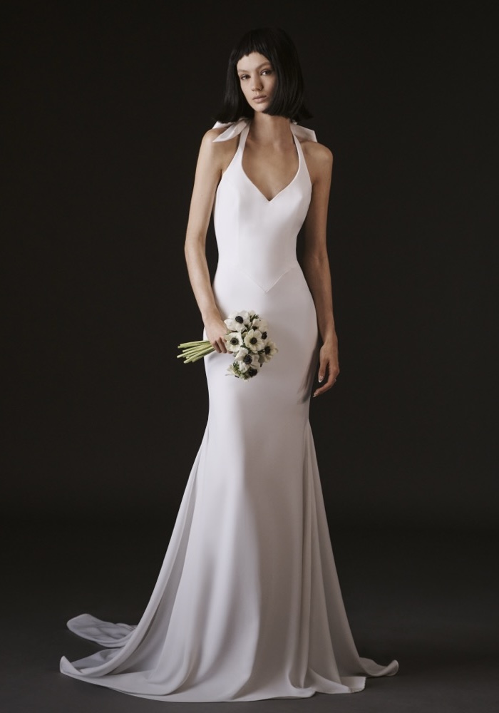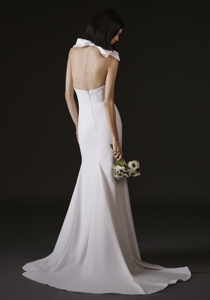 Halter neckline mermaid wedding dress in crepe with a neck bow, complemented by a tulle ruffle overskirt that adds movement and sophistication.