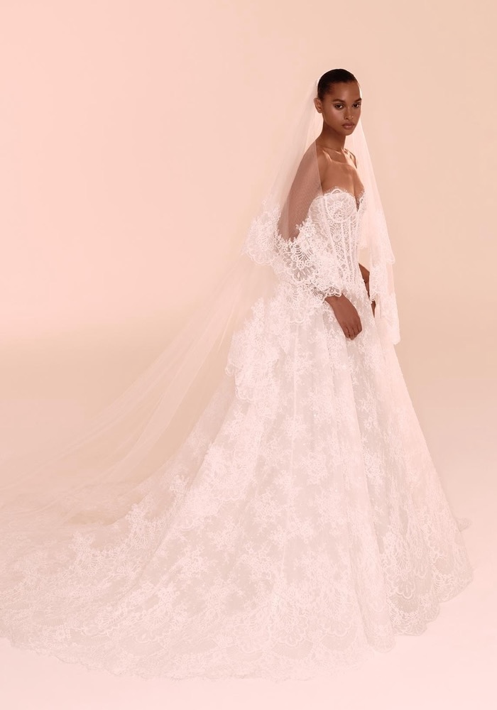 A princess wedding dress with a sweetheart neckline and detailed lace. Features a sculpting corset bodice and a statement cathedral train. For a touch of personalized elegance, layer the detachable high-neck lace blouse to create a truly distinct ensemble.
