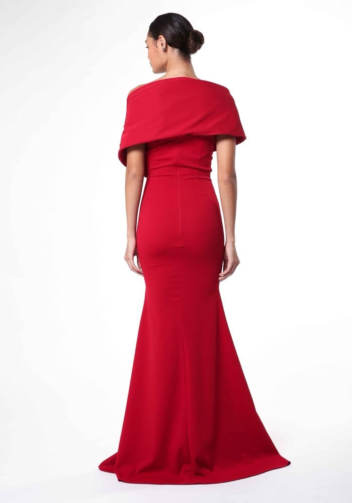 Mermaid evening gown crafted in crepe that hugs every curves. The bold off-shoulder design, highlighted with elegant pleated detail, creates a portrait of modern sophistication.