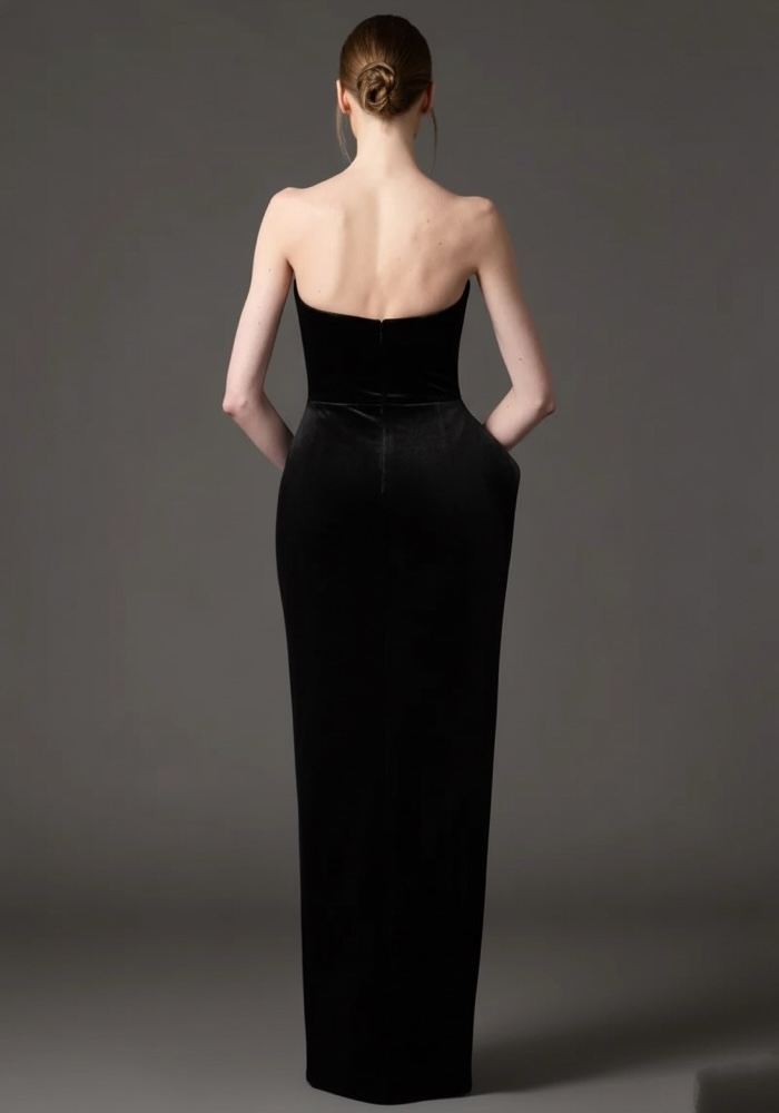 Strapless mermaid evening gown made of velvet, featuring semi-sheer tulle slit adorned with crystals and pearls.