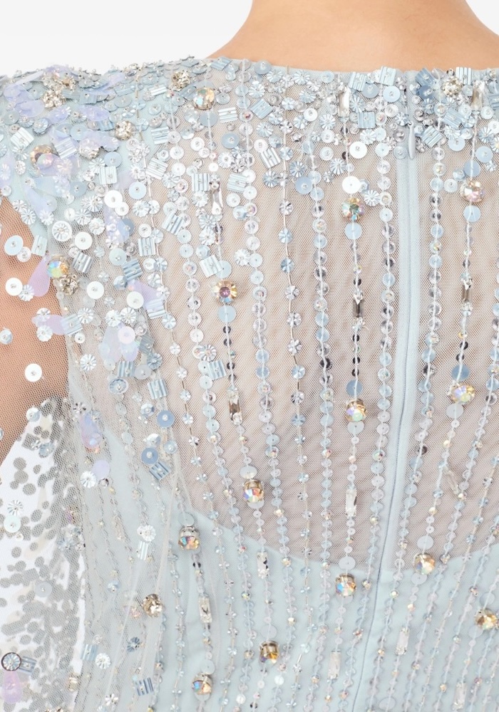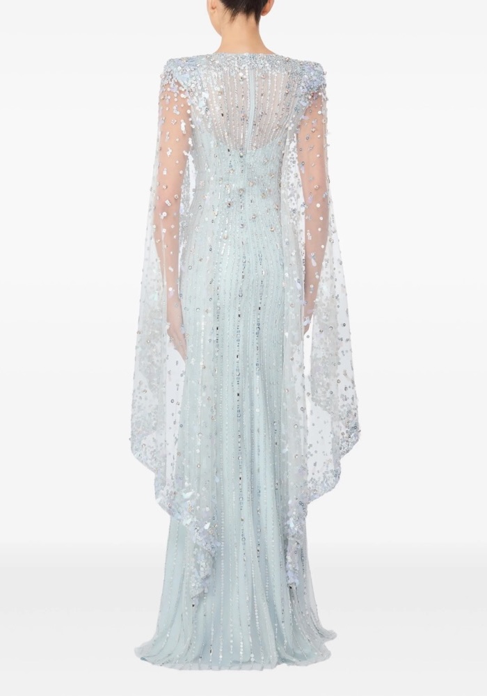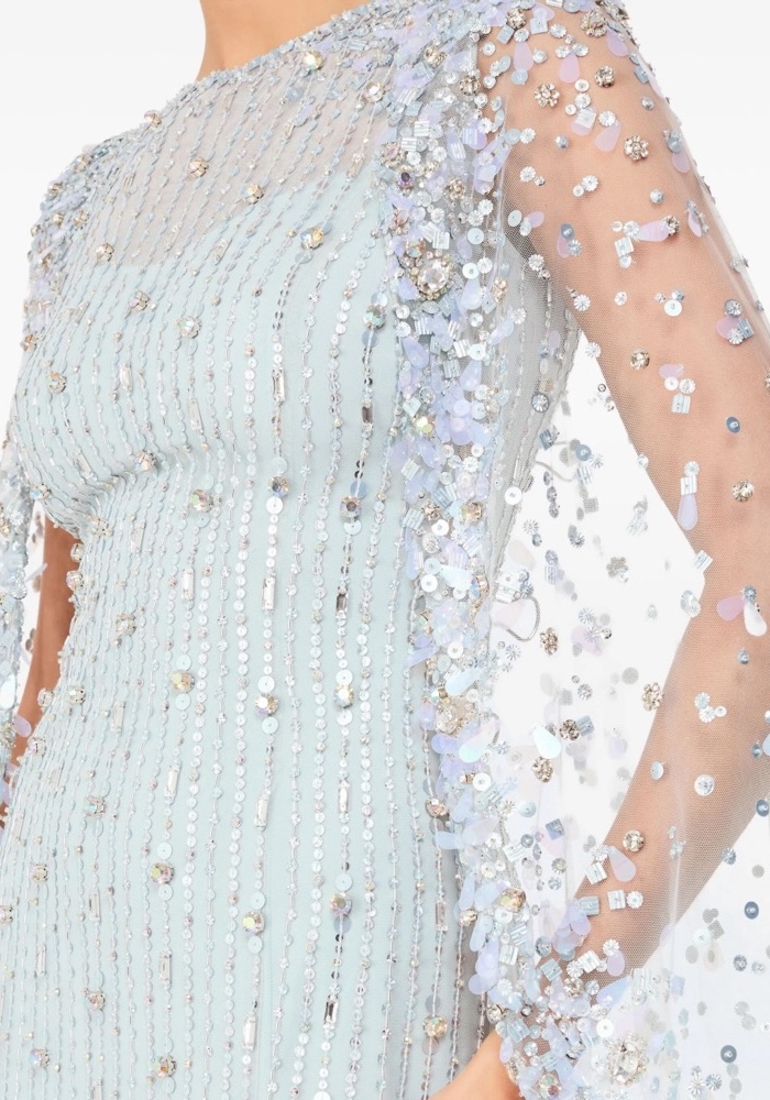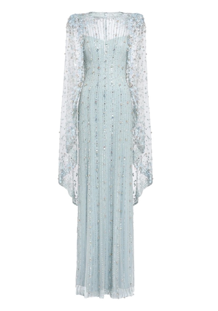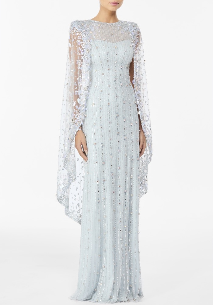 Boat neck mermaid evening gown adorned drenched in hundreds of glistening sequins and crystal gemstones, featuring illusion cape sleeves for a combination of sophistication and modern drama.