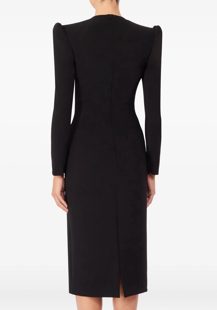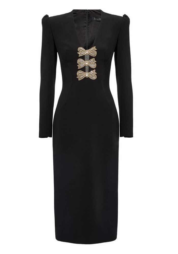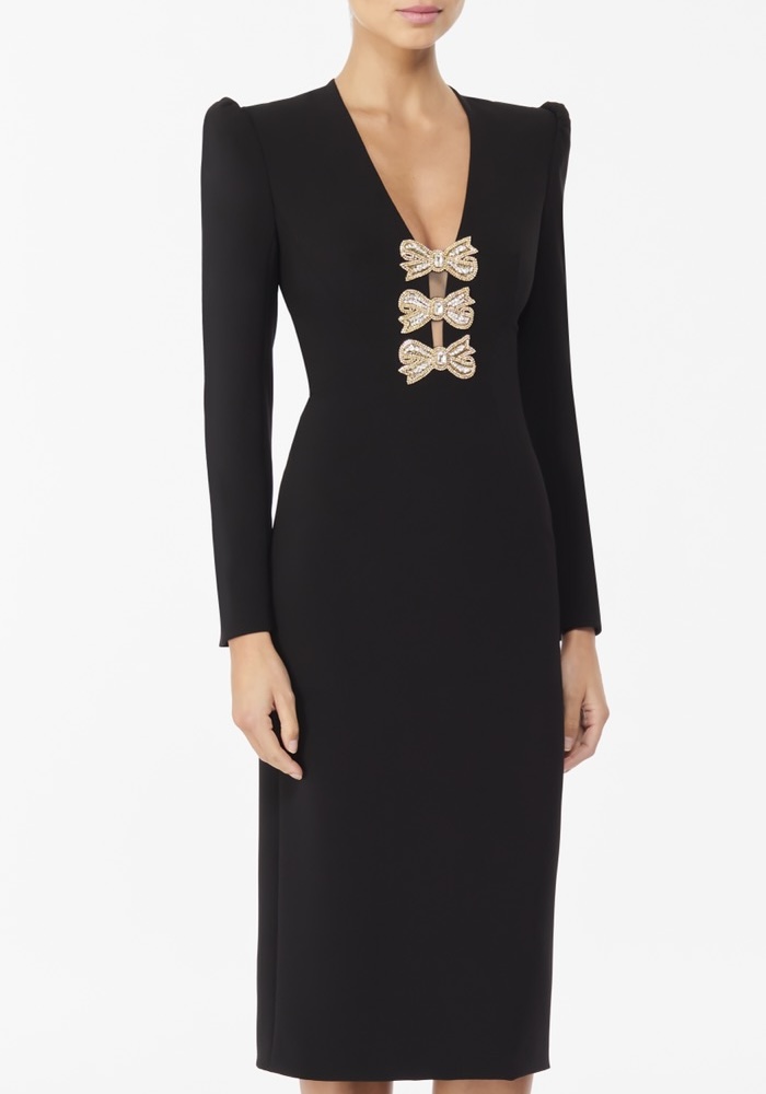 Plunging neckline cocktail dress crafted from stretch crepe adorned with trio of embellished bows, perfectly balanced by elegant long sleeves. Confident and contemporary, it's a standout choice for evening occasions.