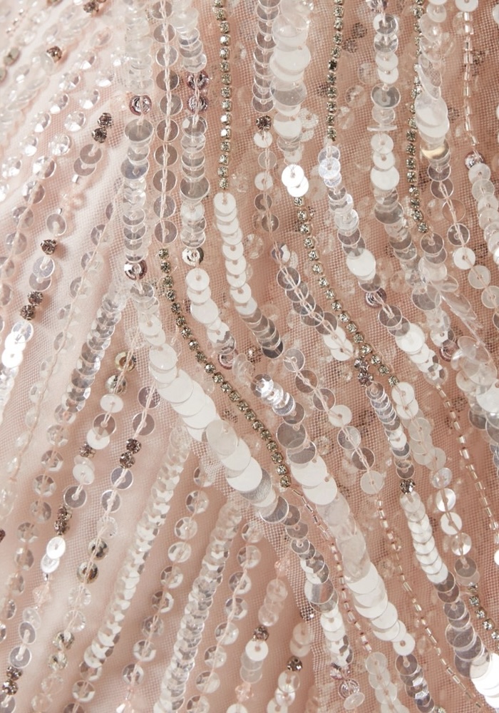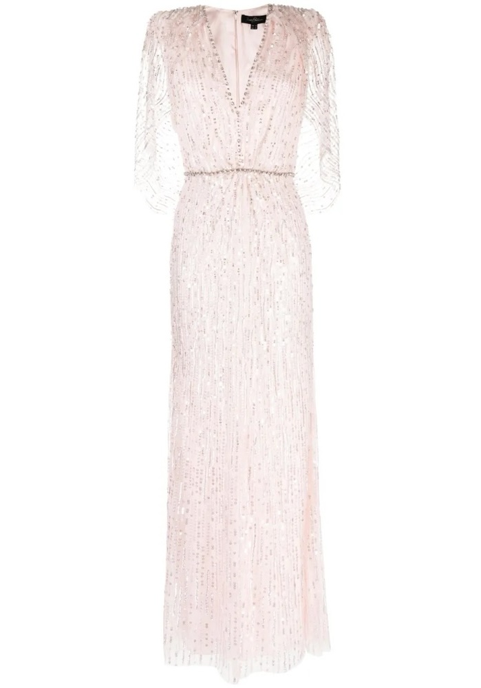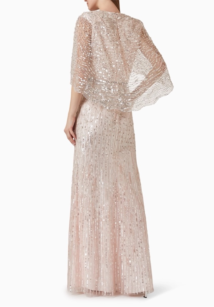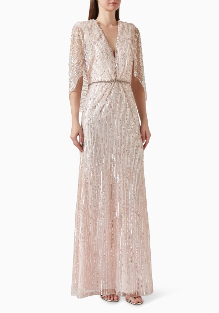 Plunging neckline column evening gown adorned with cascades of glistening beads and sequins all-over, featuring dramatic cape sleeves.