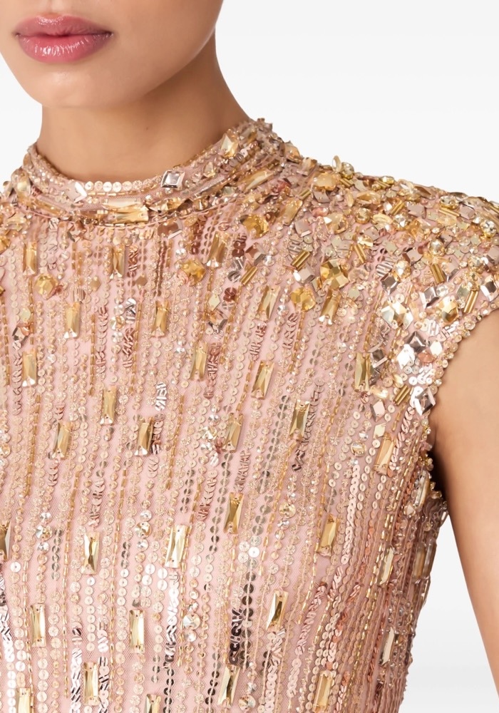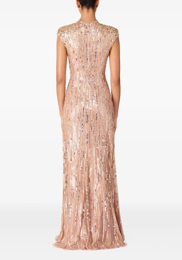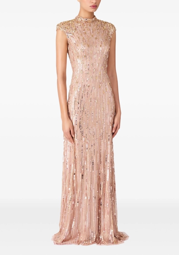 High neck mermaid evening gown with cap sleeves, adorned with a cascade of glistening sequins and intricate beadwork that dazzles from every angle.