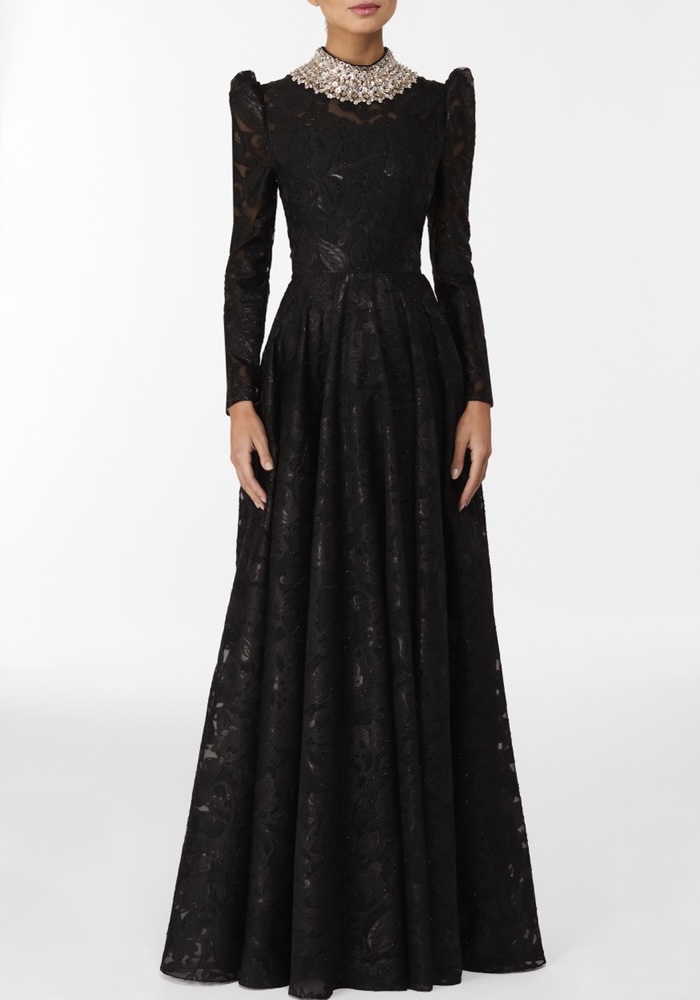 High neck A-line evening gown with a statement jewelled collar. Intricate, cascading lace flows over the elegant long sleeves and skirt, creating a silhouette of pure sophistication for your black-tie affair.