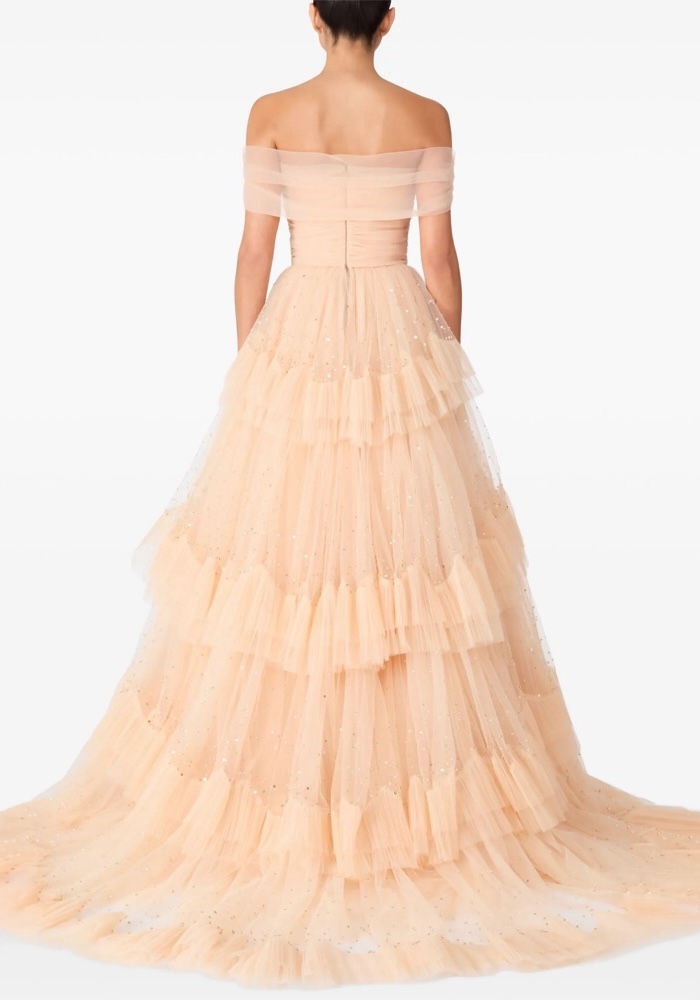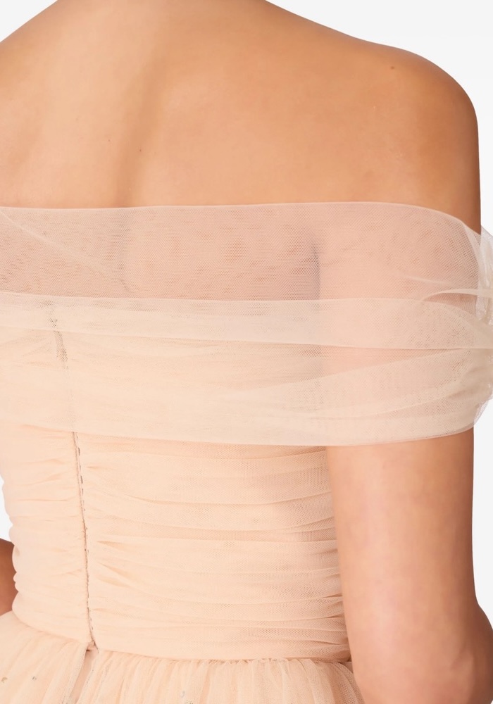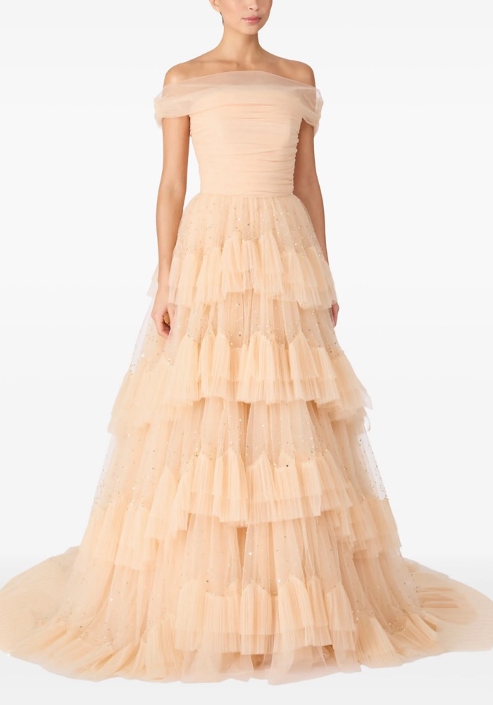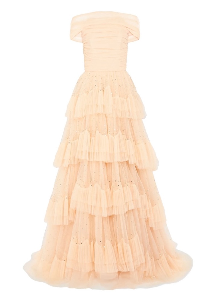 This stunning A-line gown combines timeless sophistication with modern allure. The off-shoulder neckline and artfully draped bodice create a flattering silhouette, while the layered sheer tiered skirt flows with effortless grace, adding volume and delicate movement. Subtle sparkle adorns the skirt, catching the light for a refined yet captivating glow—perfect for making a memorable entrance at any evening affair.