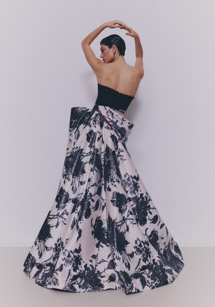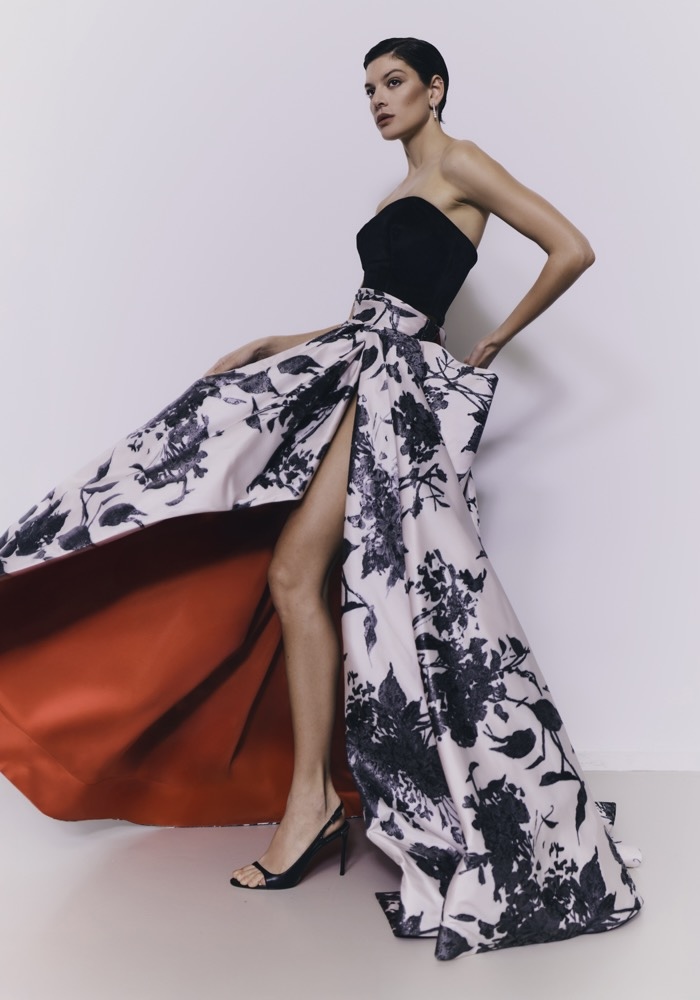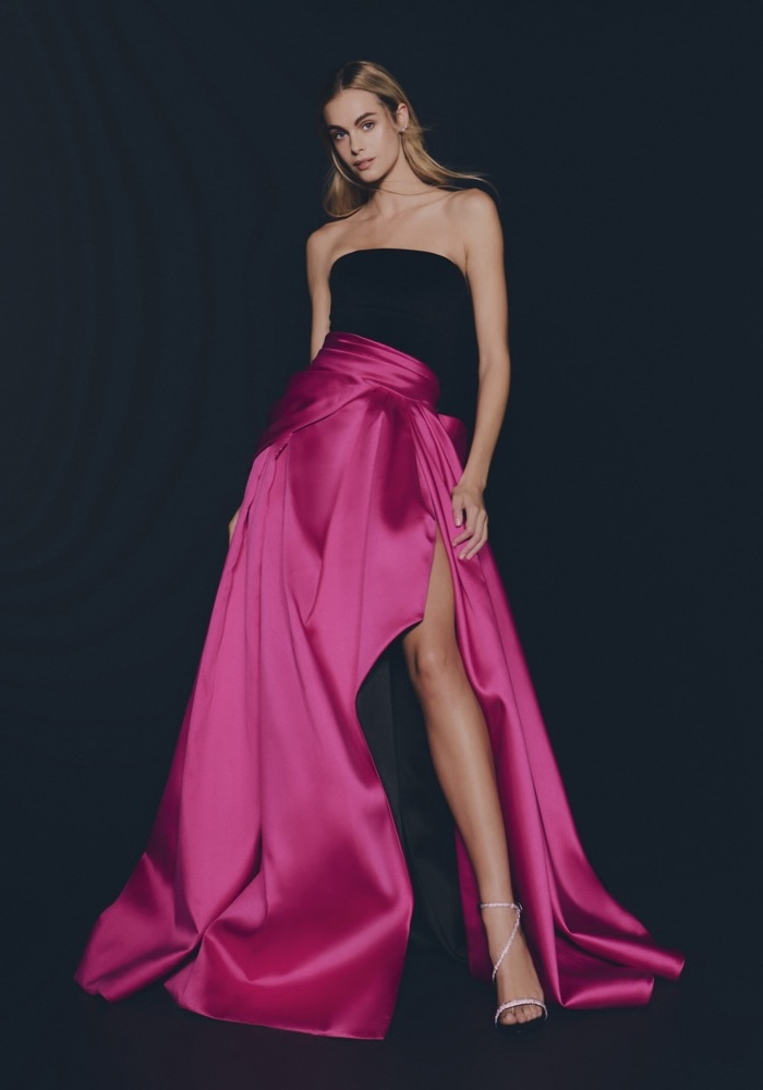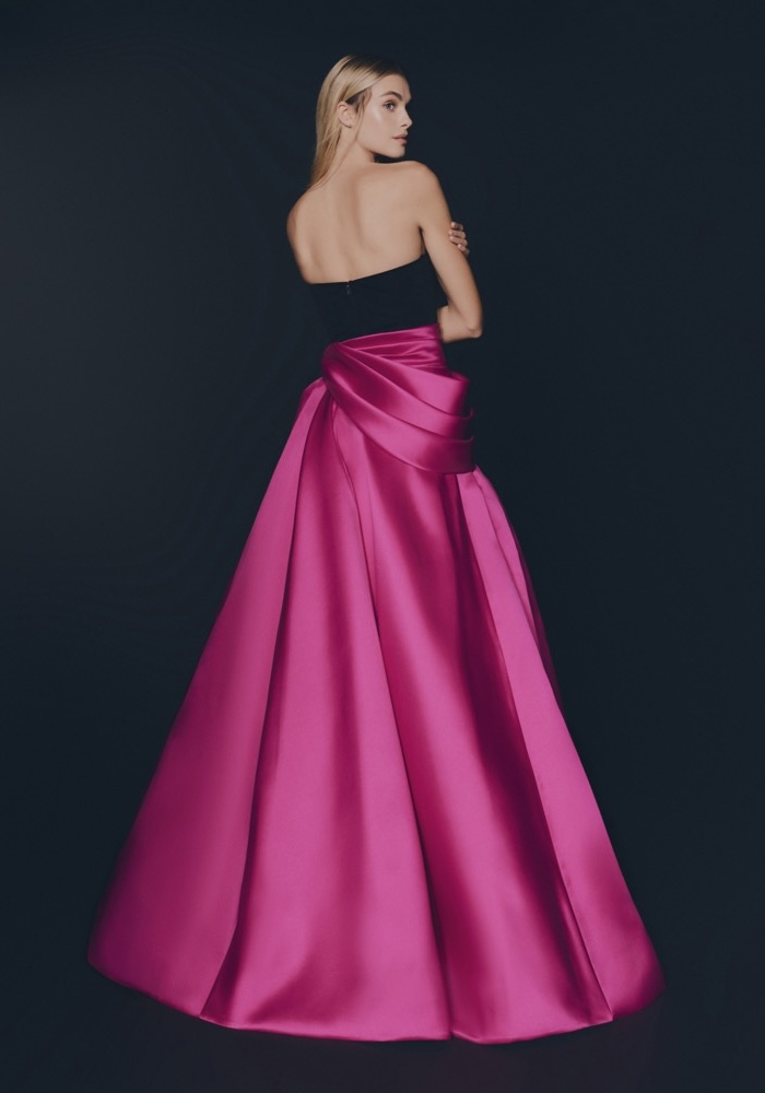 Strapless neckline A-line evening gown with a velvet top, featuring a striking play of contrast and volume with a draped satin skirt.
