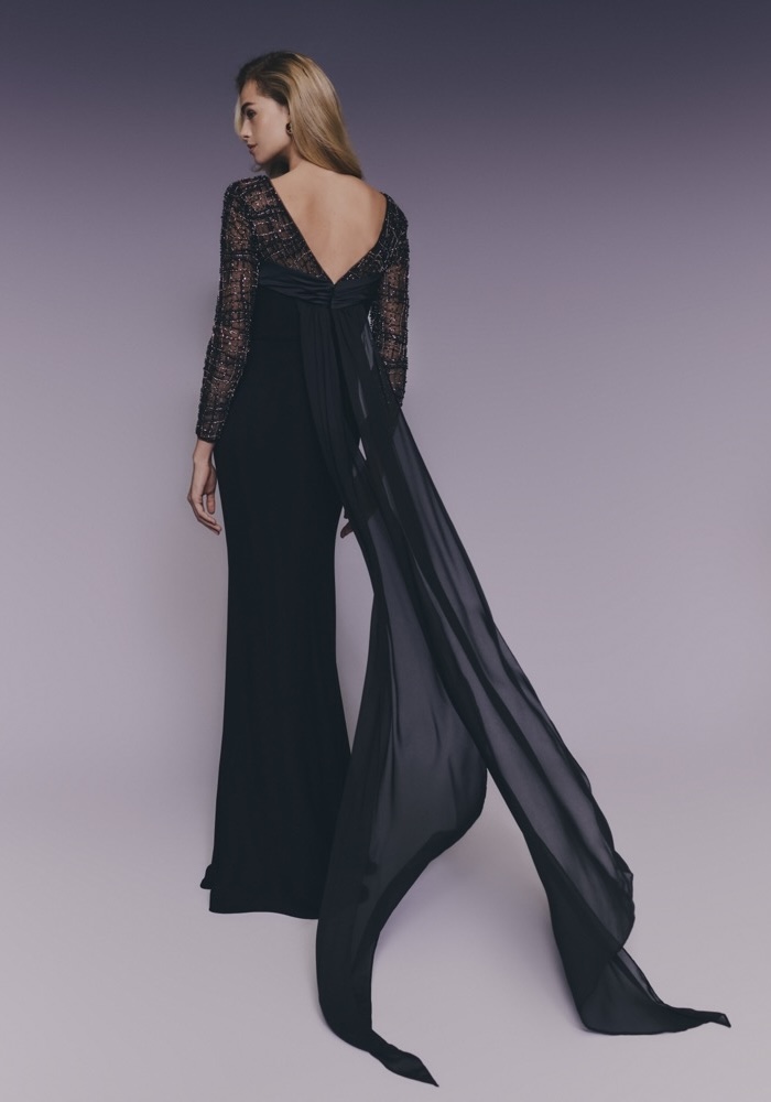 V-neck mermaid evening gown made of stretch crepe that hugs every curve. The design features embellished sheer sleeves and a draped satin bow on the bodice that flows down into two elegant straps at the back.