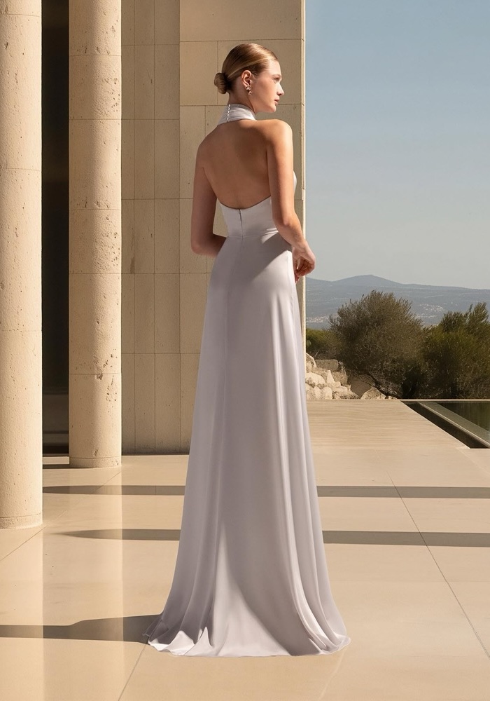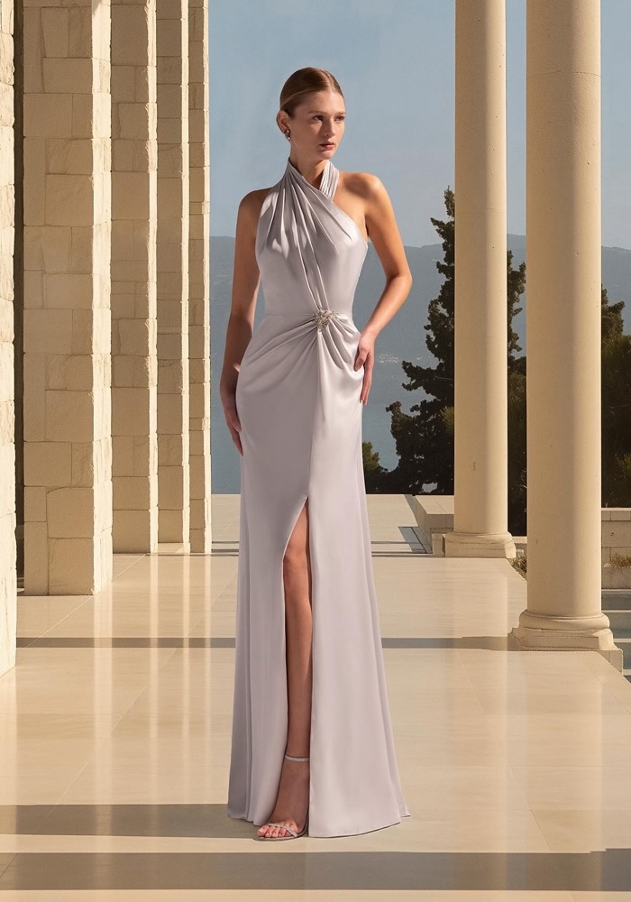 Halter neckline column evening gown made entirely from satin, featuring a beautifully draped bodice and a thigh-high slit.