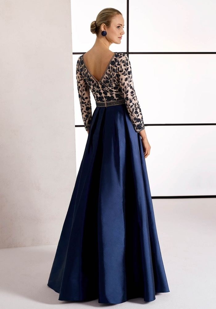 V-neck A-line evening gown with a embroidered tulle bodice and sleeves, adorned with beaded floral motifs. Pleated skirt made of taffeta with a slit.