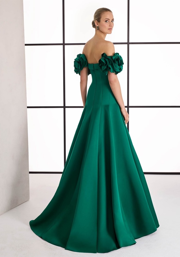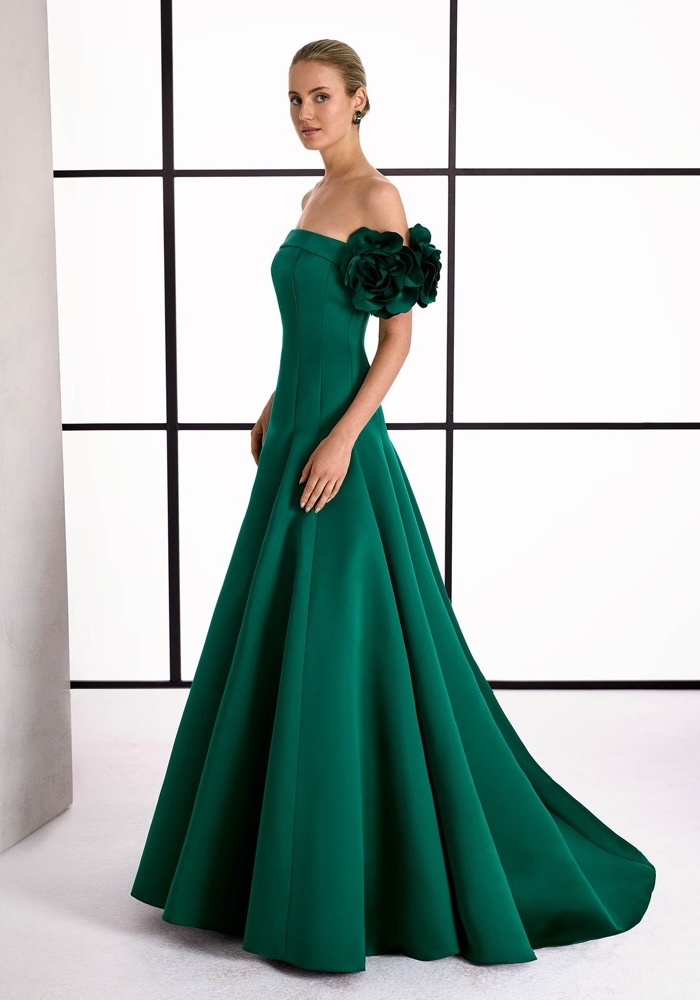 Off-shoulder A-line evening gown made of silky satin, featuring romantic rose sleeves.