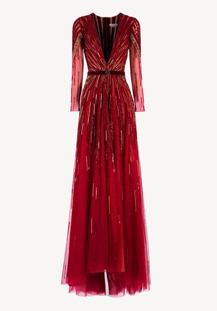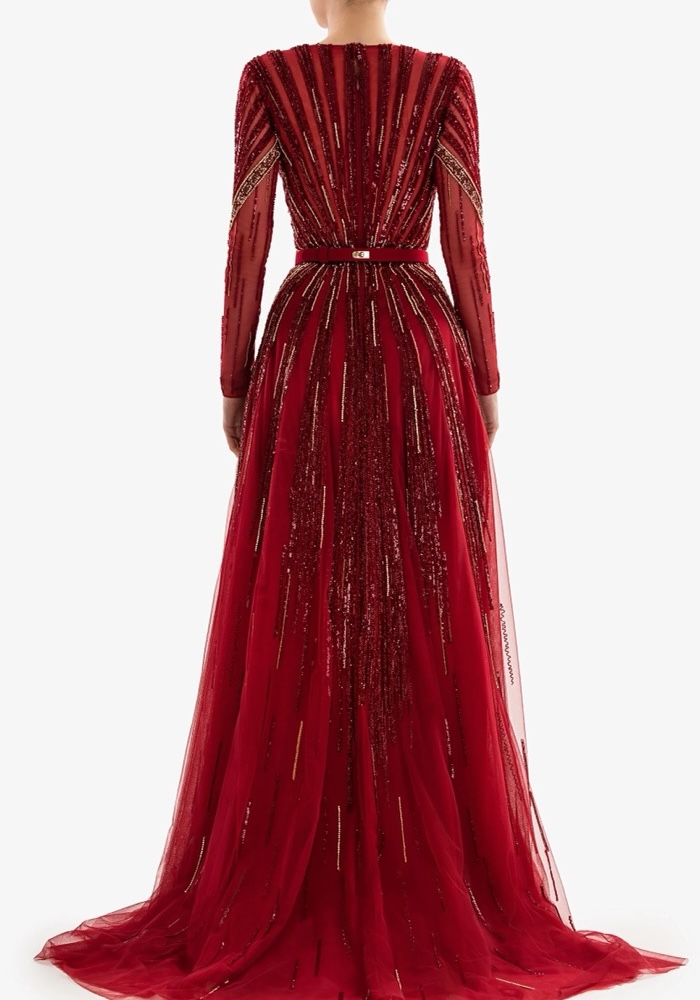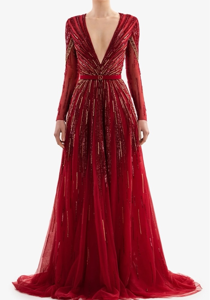 Plunging neckline A-line evening gown adorned with cascades of intricate red and gold beadwork throughout the entire gown.