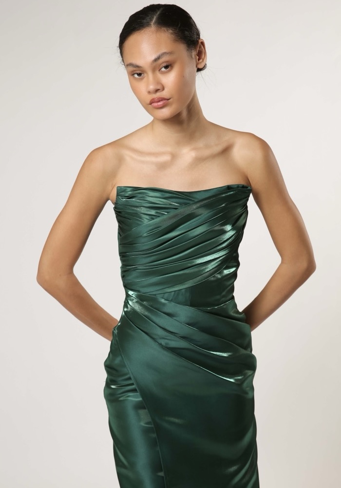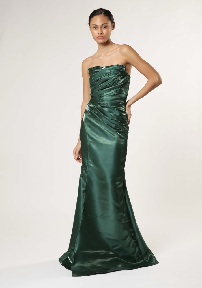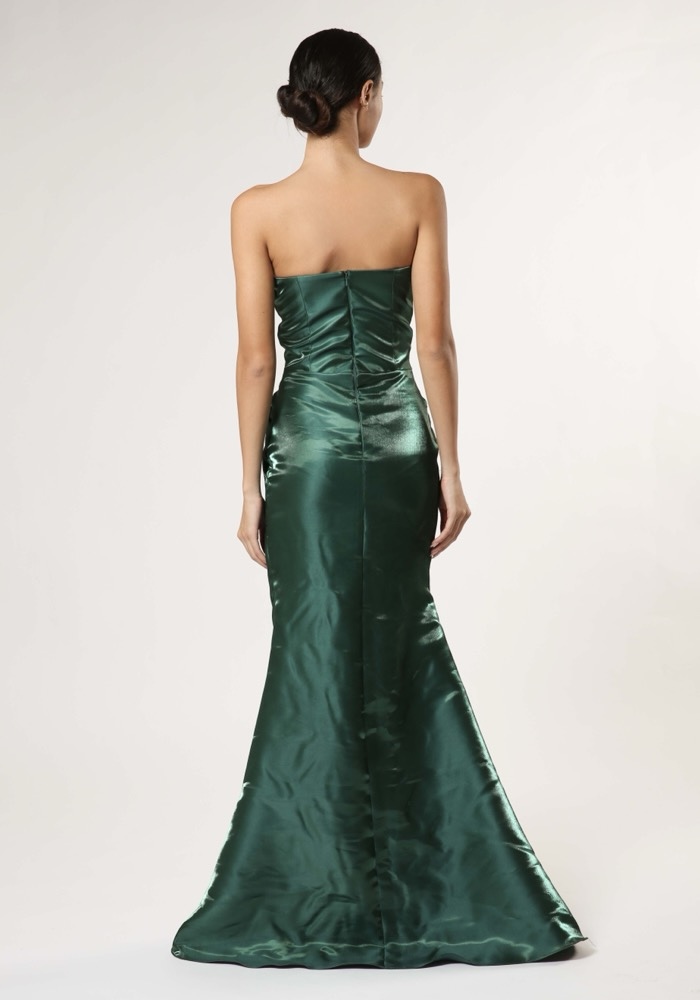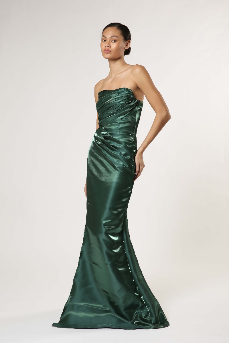 Strapless mermaid evening gown crafted from liquid organza with a beautifully draped bodice.