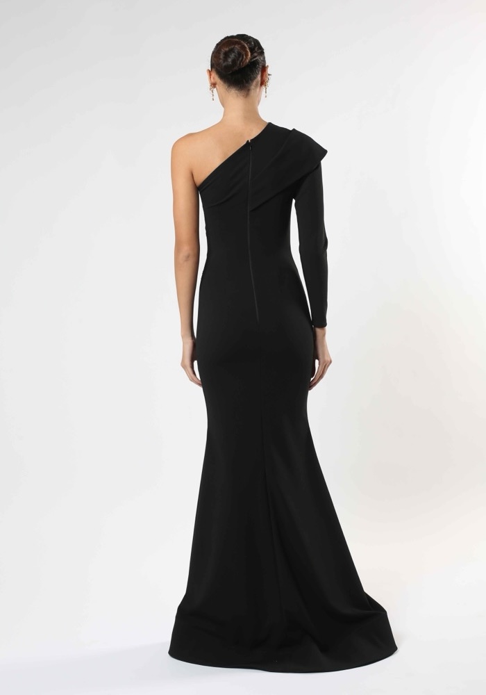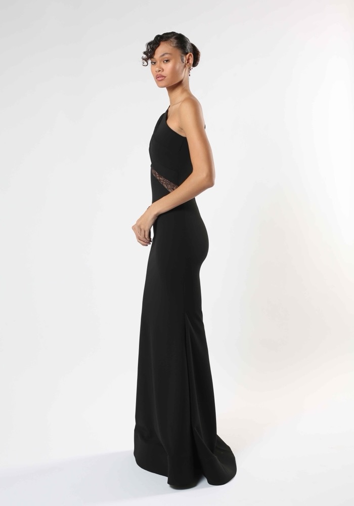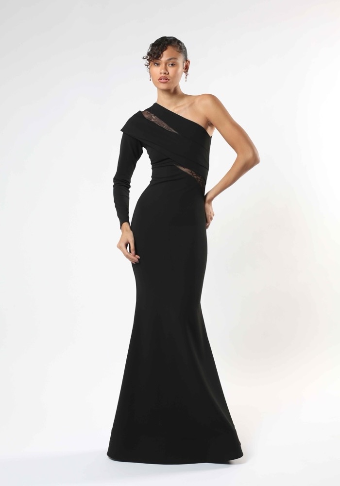 One-shoulder mermaid evening gown crafted from stretch crepe, featuring illusion lace cutouts on the bodice with long sleeve.