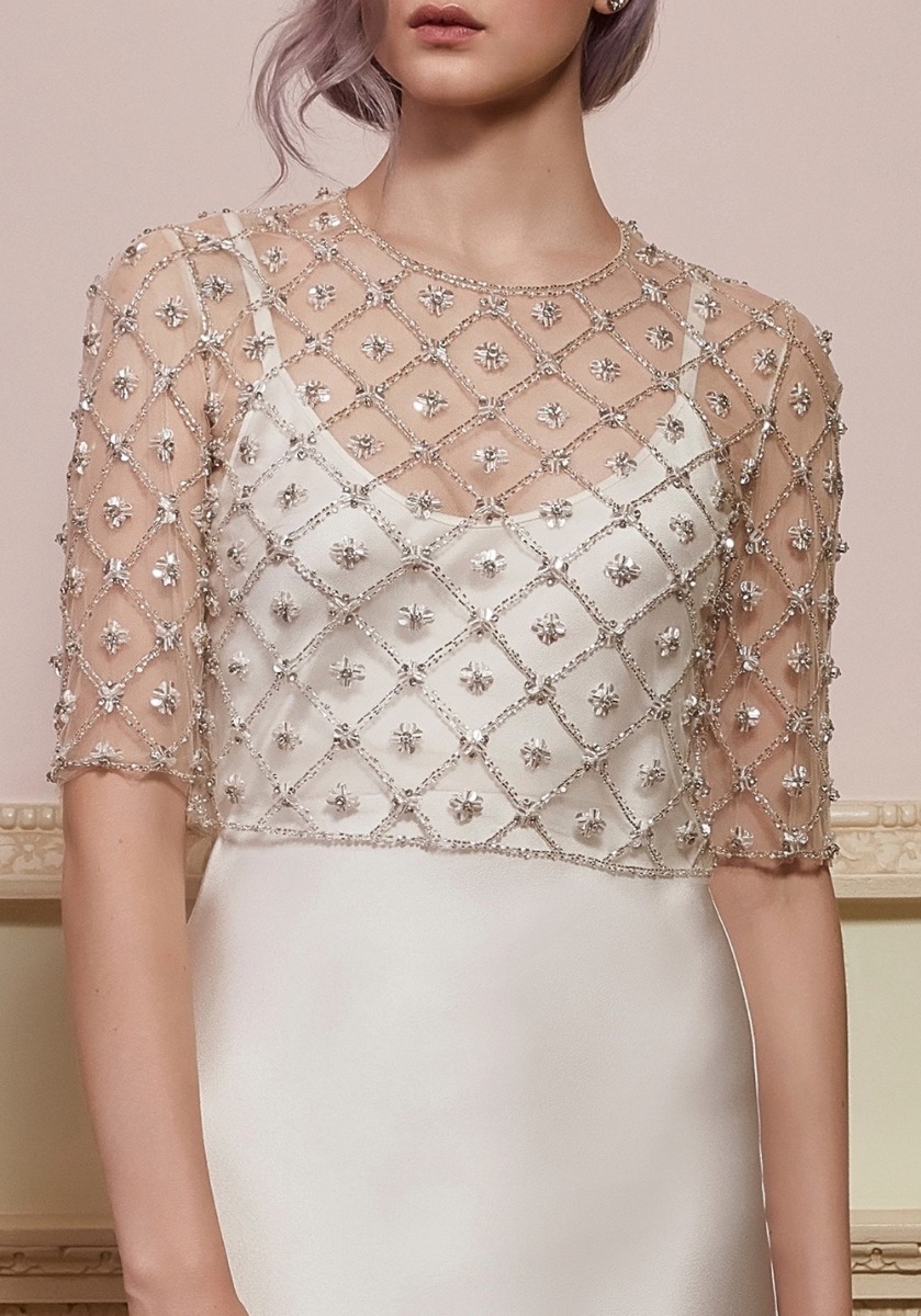 Scoop neck column wedding dress with spaghetti straps. Pair it with a gemstone embellished lattice top with mid-sleeves.