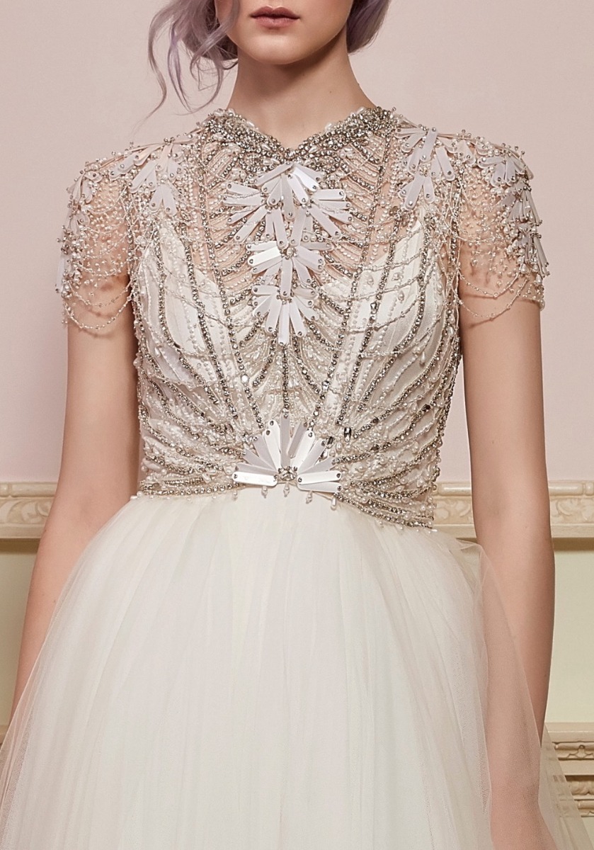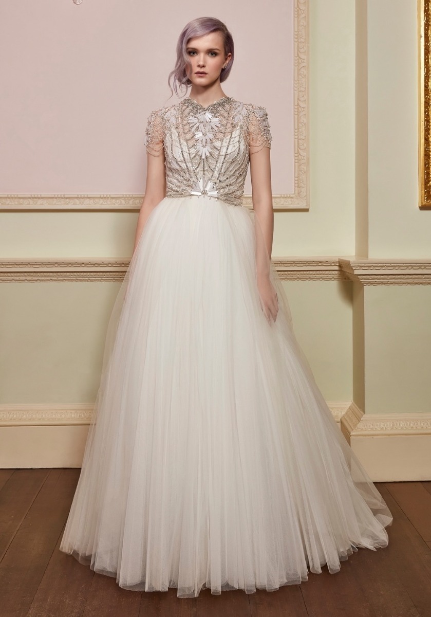 High neck embellished top in tulle with deco-inspired crystal gemstone details and sleeves. Paired with a fairytale princess skirt in tulle.